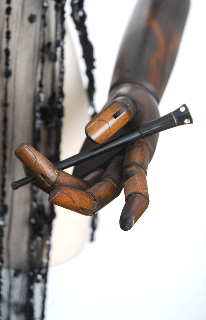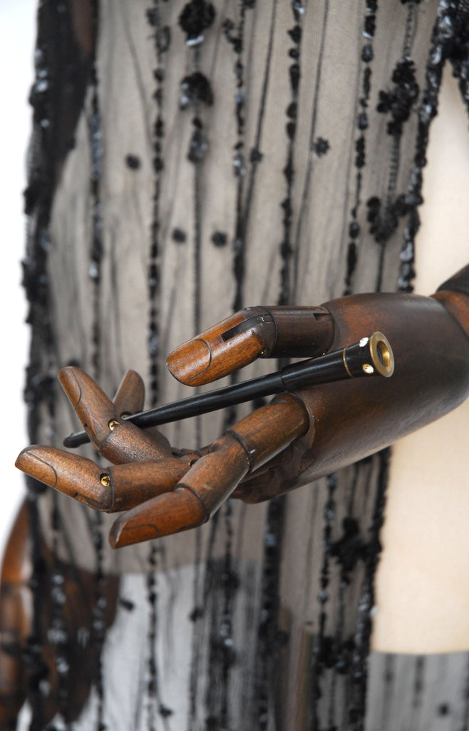 Great addition to a full 1920s-30s outfit...best to not use this for a live cigarette as may contain toxins from previous use. But, still makes for a fabulous addition to an outfit of the period. Many of these holders were bakelite or dark wood, this feels like the latter but I am not completely sure. Metal brass tip and great rhinestone detail.