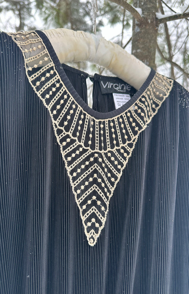 Gorgeous dress! French-made micro pleats which enables plenty of give, falls beautifully and just a classic silhouette, very wearable with pretty cut out at the collar and single button at the back of the neck, elastic waist. The shoulder are turned in and constructed in a Grecian style, the bodice blouses beautifully, clings in the right places but allows for movement, just a wonderful dress. Made by Virginie of Paris, polyamide fabric.