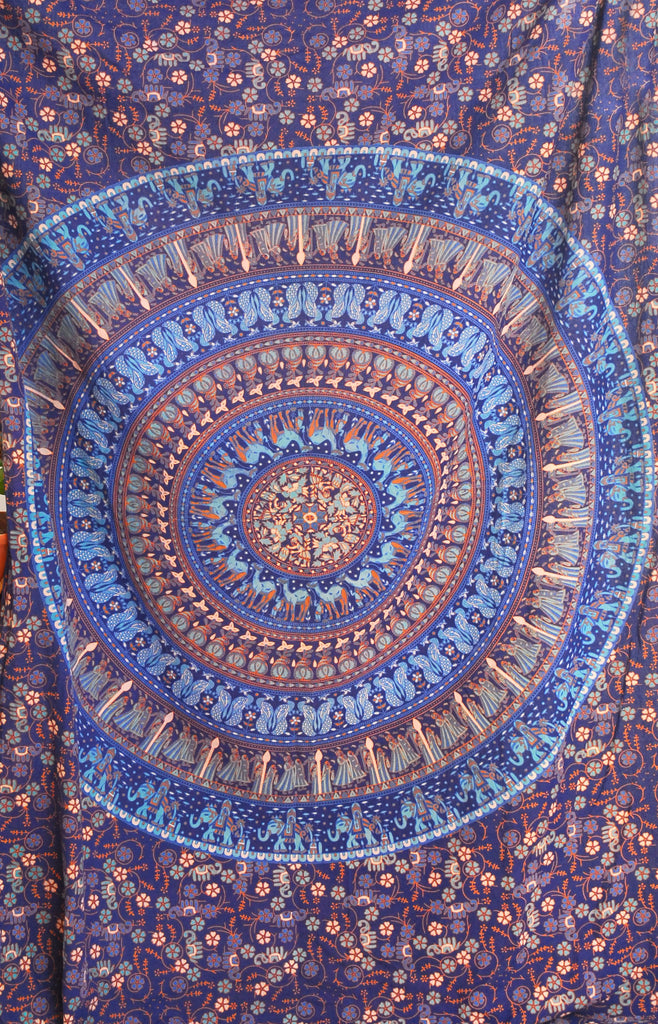 Excellent color way in this 1970s cotton throw, detailed print with no labels. Wonderful color print with elephants, figures, peacocks, and flowers. Print is Indian or Persian in origin.