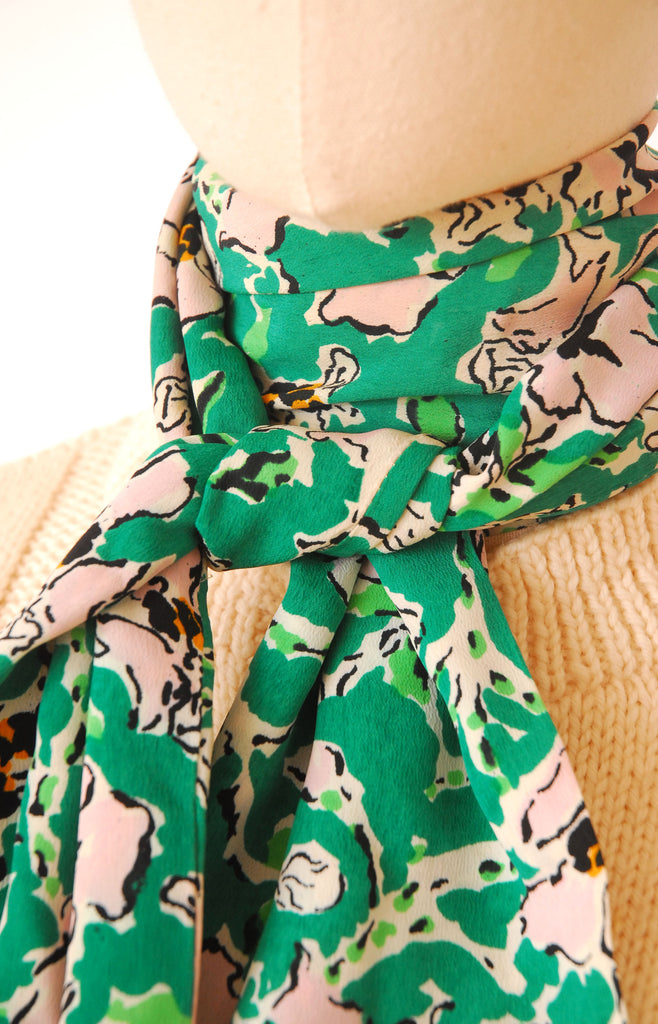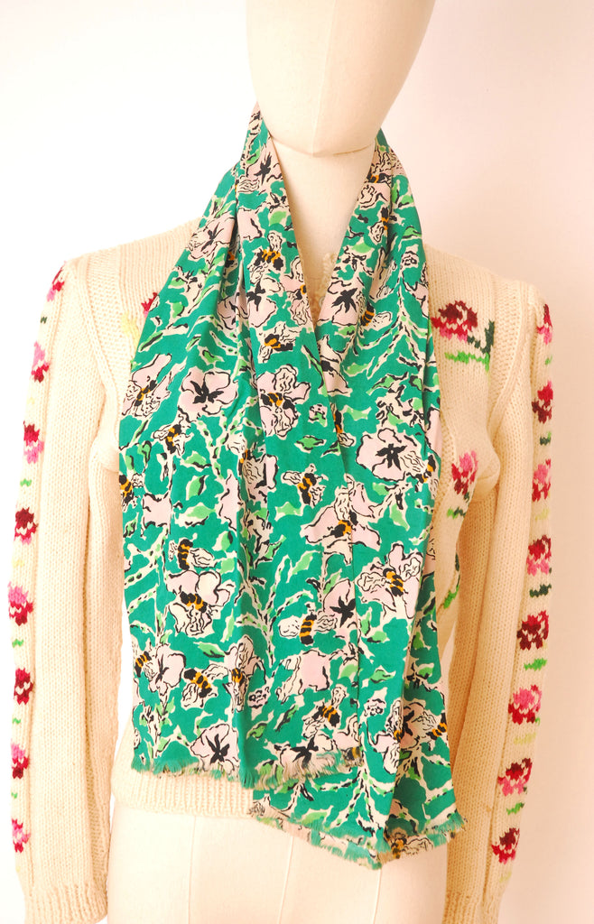 Great colors in this cold rayon scarf, works very well in all seasons as can be wrapped for winter warmth or worn loose in spring, also great for a headscarf. Pretty pansy and bee print and raw edging. Fabric is a sewn tube.
